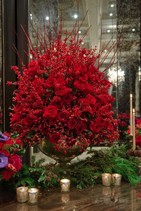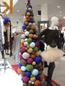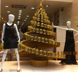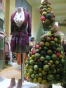 Aproveite a dica anterior e use seus próprios produtos como enfeites. Você pode conseguir um efeito lindo usando somente produtos da mesma cor, como fez o exemplo de decoração de natal para porta de loja da imagem abaixo.