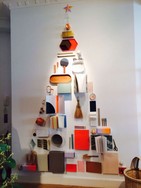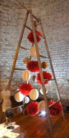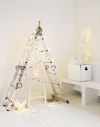 É o caso da loja mostrada na imagem abaixo. Ela usou uma escada de construção como centro de sua decoração, tornando ela a árvore de Natal.